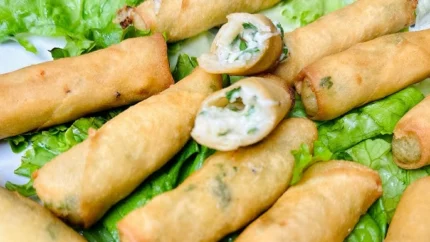 Feuilles de brick farcies au poulet, vermicelles et épices marocaines.